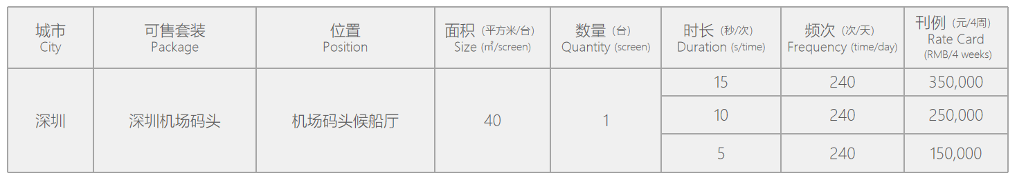 该媒体所处位置是深圳机场码头候船厅,媒体面积巨大、表现形式丰富多样、具有醒目、冲击力强的展示特点。